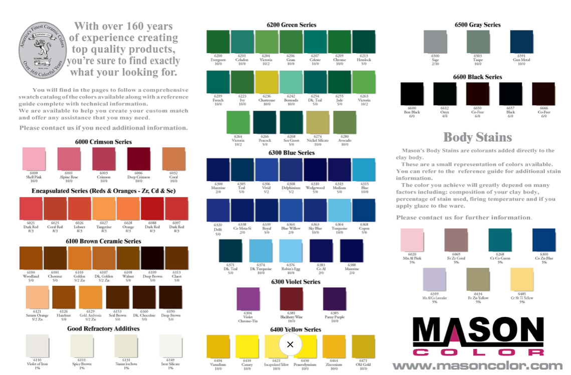 The list below are the Mason Stains we currently have in stock here at Ceramic Supply Florida. If you do not see what you are looking for reach out and we can order it for you.
